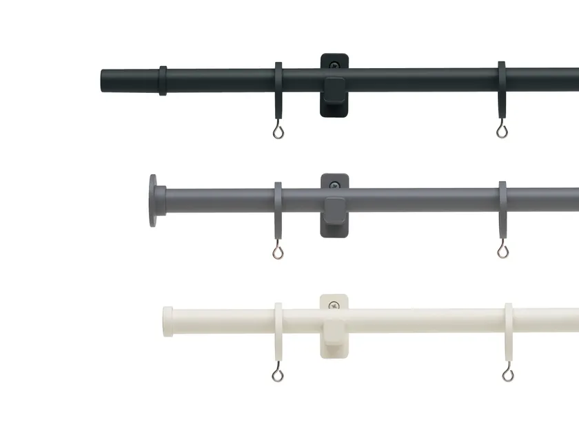 直径16mmのポールと、キャップ、ブラケット、リングランナーは無駄を削ぎ落したシンプルなデザインのカーテンレール。カラーラインナップはブラック、ダークグレー、ラテホワイトの3色展開で、カーテンや壁などのインテリアアイテムを引き立て、様々な空間になじみます。
