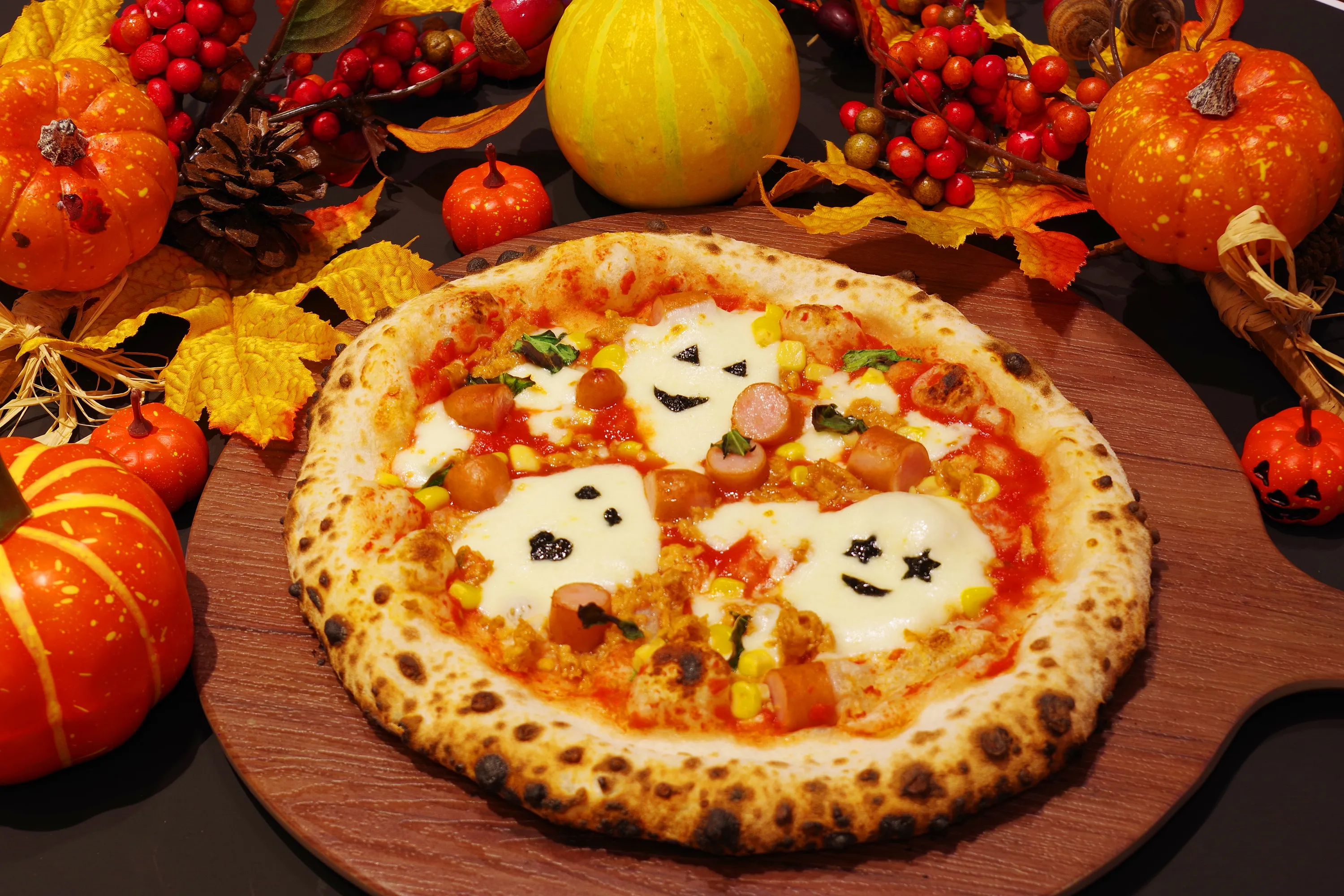 小麦の収穫を祝うために、親子で一緒にピッツァづくり。生地をこねて、具材とチーズをのせて本格的なピッツァ窯で焼き上げると、ピッツァの上には様々な形の“おばけ”が登場…!