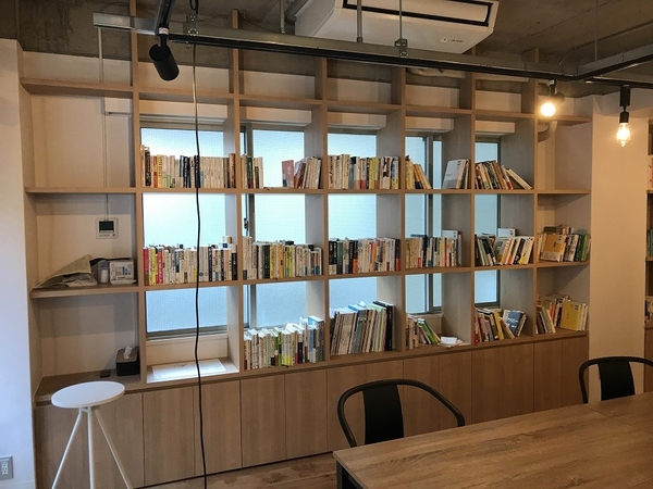 事務所の窓際に、天井の高さまで作りつけた本棚を置いてみました。既製品の本棚を置くよりもガラッと部屋の雰囲気を変えてくれます。本棚の隙間から採光が入るため、「本棚を置く場所がない」という小さい事務所でも、窓際のスペースを利用して本棚を設置することができます。