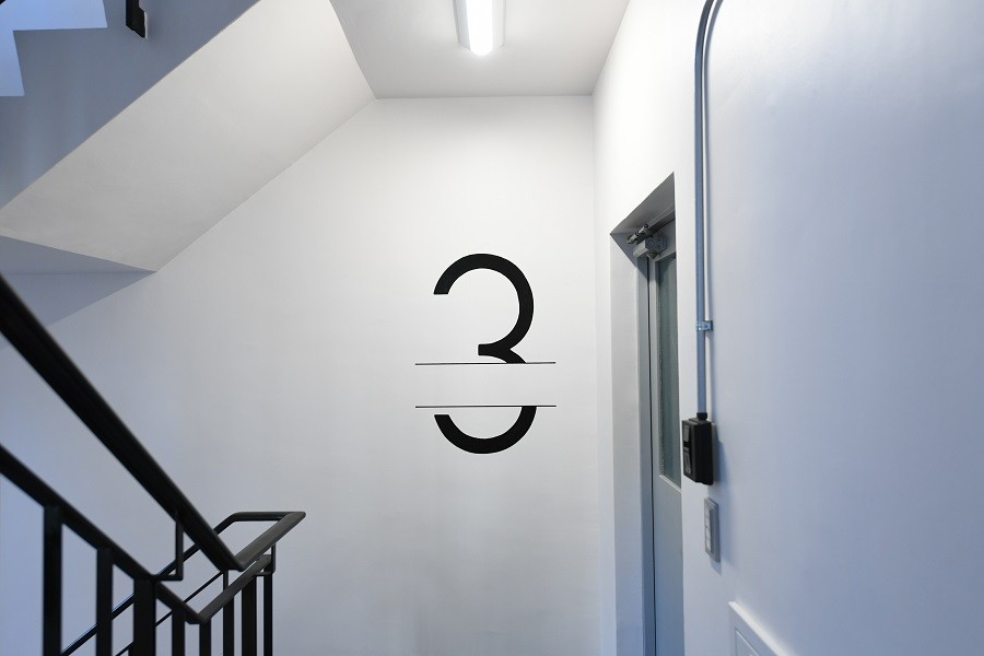 例えば、階段のフロア表示やエレベーターの階数表示を、洗練された大きい文字にすることで、雰囲気がおしゃれになります。
