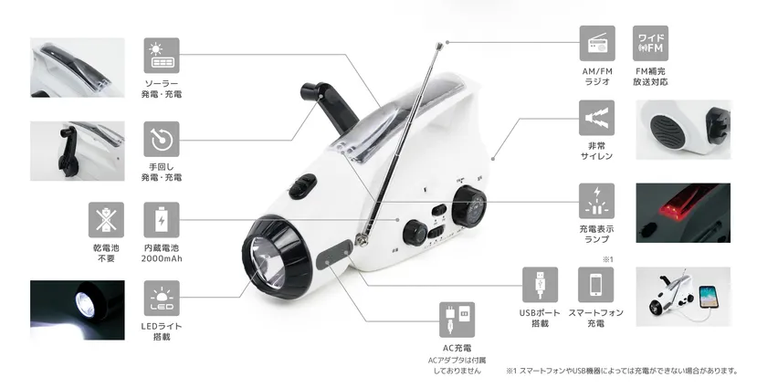 ※3:手回し充電・ソーラー充電は、電力の供給が無い非常時にラジオライト本体を充電するためのオプションです。通常使用時は、USB充電のご利用を推奨いたします。