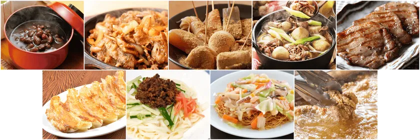 ●十勝のぜんざい ●青森バラ焼き ●静岡おでん ●山形芋煮 ●仙台牛タン ●宇都宮餃子 ●岩手じゃじゃ麺 ●長崎皿うどん ●大分中津からあげ
