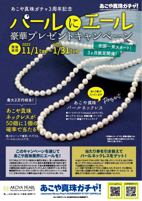 そしてこの度、2万円相当のあこや真珠ネックレスが当たる、大当たりガチャを3か月間限定で開催いたします。