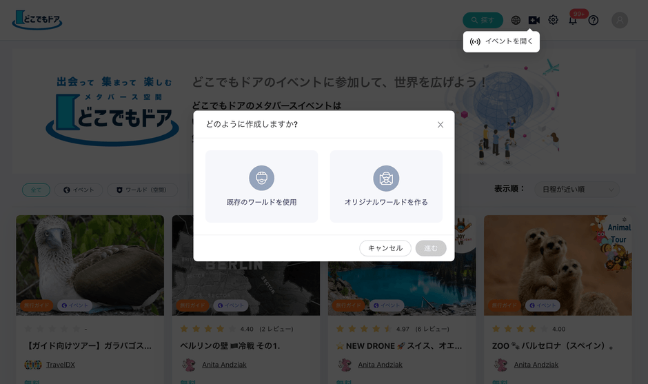 世界100か国で活躍する「ガイド」と呼ばれるメタバースイベント開催者に限定されていた「イベントを開く」機能が、「どこでもドア」のユーザー全てに開放されました。