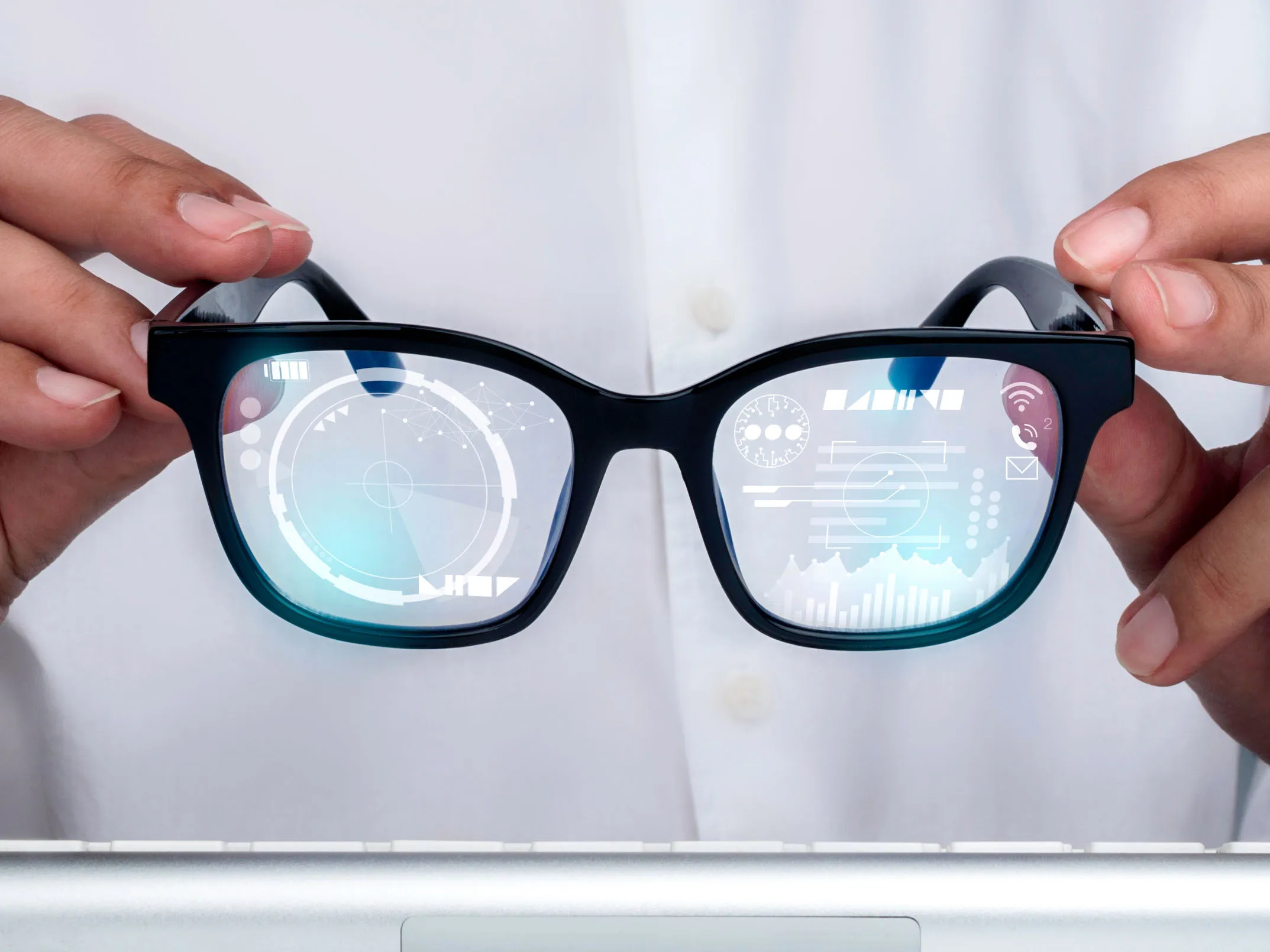VRではメタバースによる仮想空間マーケットの創出、ARでは脱スマホを目指し、スマートグラスなどの開発が進んでいます。従来のAR用の半導体レーザーでは300um長が限界でしたが、京セラは3分の1の100umの大きさを実現したため、低消費電力にも繋がります。低消費電力化した半導体レーザーを用いることで、バッテリーを小型化、軽量化することができ、装着感が向上します。 ARグラスイメージ
