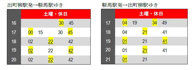 市原駅19:43発出町柳駅ゆきは鞍馬駅19:34発として運行します。