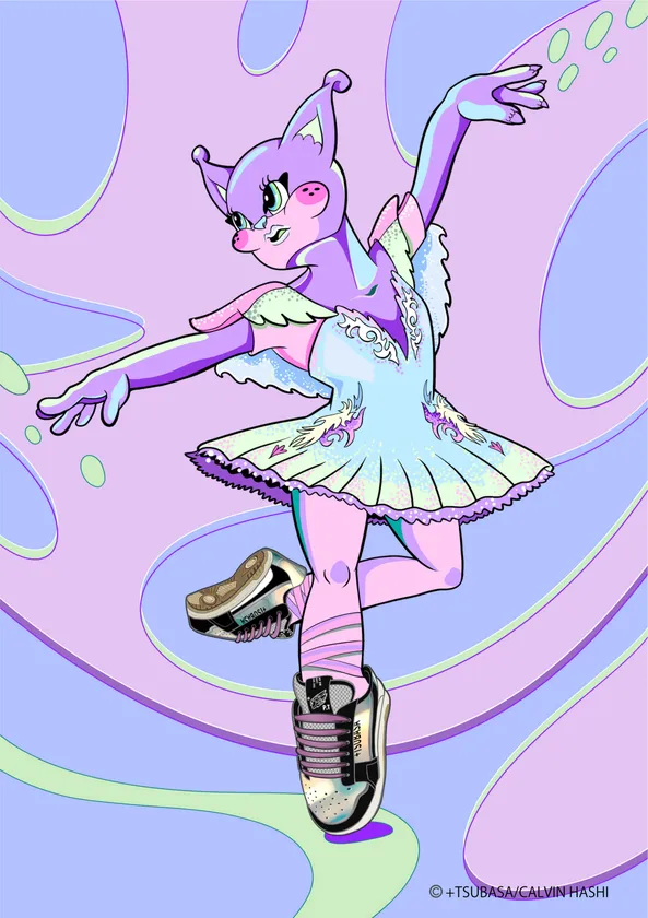 渋谷スクランブルスクエアにて開催するポップアップストアでは、プラスツバサのスニーカーとカルヴィン・ハシのアート作品を展開。オリジナルキャラクター「エイリアンキャット」が+TSUBASAのスニーカーを履いて様々なジャンルのダンスをするポップなアートになりました。ファッションとアートで同じアイテムを同時に楽しむという新しい形をご提案します。