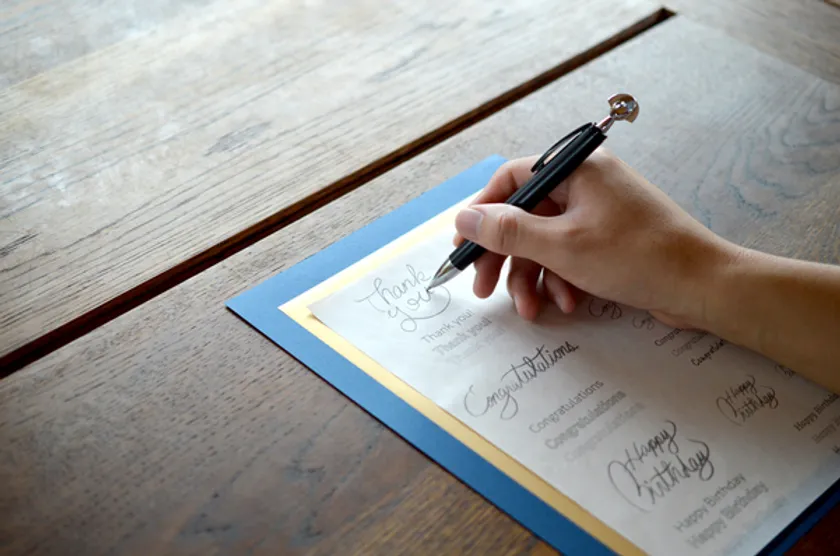 「煌葉-kiraha-」の上からボールペンで描いたときに、紙が筆圧で凹むところに箔が入り込んで転写される仕組みです。筆圧を強く描くことで、文字のとめ、はね、はらいの先端まできれいに転写できます。