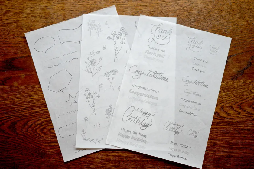 今回のリニューアルでは、ユーザーからの要望を反映し、さらに「煌葉-kiraha-」を楽しんでいただけるよう、従来のB6サイズからB5サイズへと大きさを変更しました。新たに付属するお祝いや感謝の言葉のテキスト、ボタニカルデザイン、デコレーションデザインの3種類のテンプレートを重ねてなぞるだけで、美しい文字や絵柄を書いて楽しむことができます。また、今回より数量限定品だったシルバーも通常商品として発売します。メタリックペンとは異なる風合いを転写で表現できるようこだわりました。