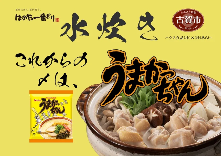 鍋シーズンに向けて株式会社あらいでは博多の郷土料理である水炊きの〆に「うまかっちゃん」を提案します。「うまかっちゃん」は、福岡県古賀市のハウス食品福岡工場だけで製造されており、どちらも古賀市にゆかりがあることから、この度、古賀市限定のふるさと納税返礼品として企画いたしました。