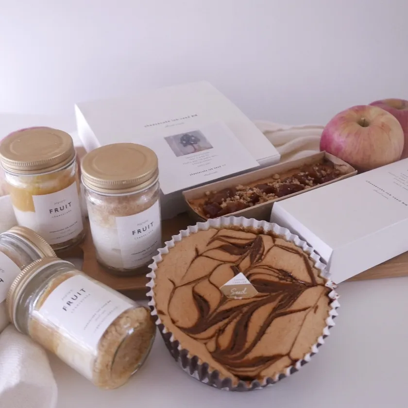 青森県産りんごを鹿児島県産粗糖で煮詰めて、有機米の米粉のクランブルと焼き上げたチーズケーキです。甘酸っぱいりんごとザクザクのクランブルの食感をお楽しみください。