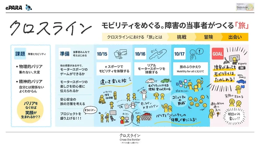 バリアフリーeスポーツを提唱する株式会社ePARA(本社:埼玉県戸田市、代表取締役:加藤大貴)は、一般財団法人トヨタ・モビリティ基金(住所:東京都文京区、理事長:豊田章男)主催のアイデアコンテスト「Mobility for ALL - 移動の可能性を、すべての人に。」において「クロスライン-ボクらは違いと旅をする-」の採択を受け、活動しています。8月から開始した本プロジェクトには、視覚障がい・聴覚障がい・肢体不自由・知的障がい・難病など特性が異なる30名以上の障がい当事者(ドライバー)が参加。eスポーツを通じてモータースポーツの世界を学習しながら参加者同士の絆を強め、違いを尊重しながら参加者全員が楽しめる旅を目指しています。