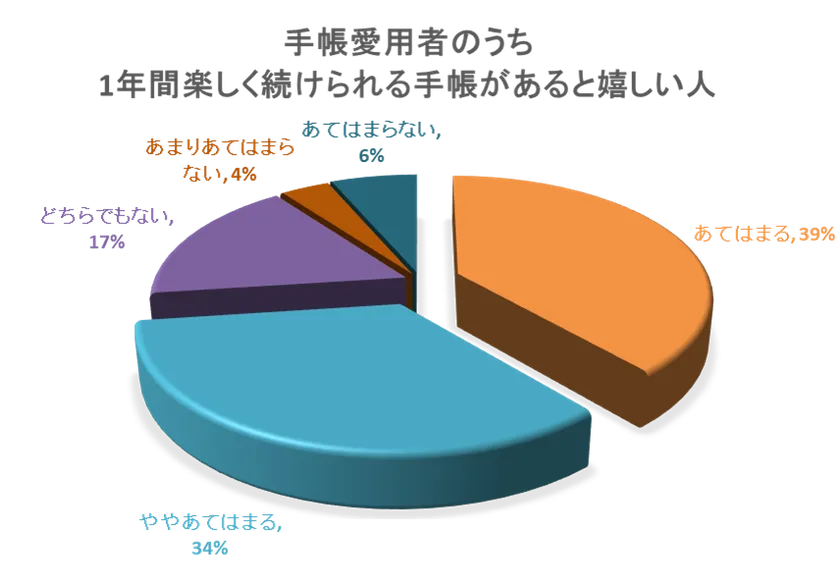 「手書きの手帳の愛用者のうち1年間楽しく続けられる手帳があると嬉しい人」と質問したところ、『あてはまる』39%『ややあてはまる』34%と回答しました。こちらも70%以上の方が楽しく使える手帳を持っていないという結果が出ました。