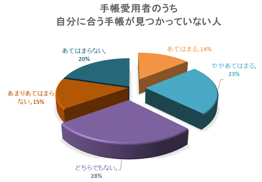 「手書きの手帳の愛用者のうち自分に合う手帳が見つからない人」と質問したところ、『あてはまらない』20%『ややあてはまらない』15%と回答しました。約65%の方が本命の手帳に出合っていないという結果が出ました。
