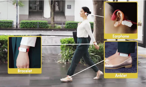 自分の印象や健康に関わる日常生活の歩行を、美しく正しくコーチングするシステムです。耳、手首、足首の3ヵ所に装着した小型ウェアラブルセンサから、歩行解析AIが歩行印象の評価と全身の歩行姿勢の推定を行います。ユーザはアプリを通じて、リアルタイムな音声コーチングを聞き、自分の歩行姿勢をアニメーションで確認することができます。