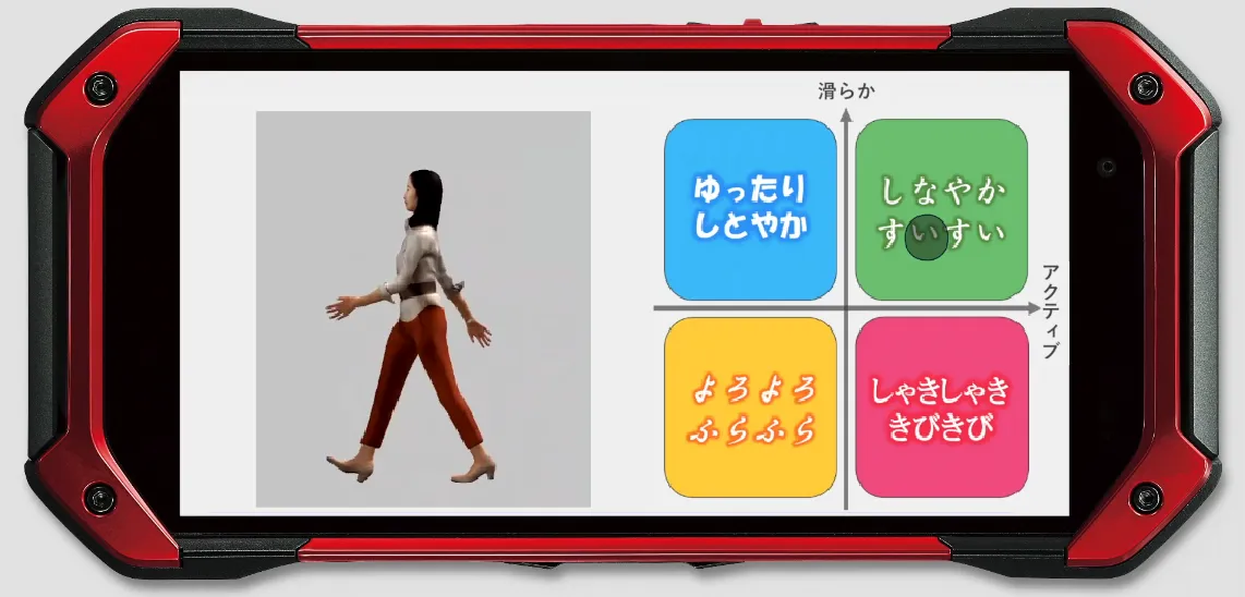 画像:歩行中のアニメーションと印象評価結果の表示