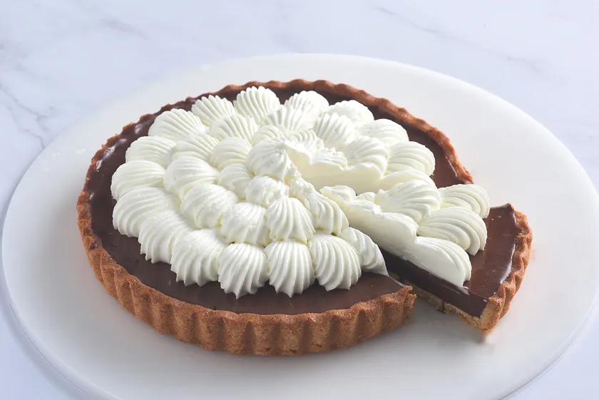 カカオの苦味と酸味、甘さのバランスが良いダーク・クーベルチュールと、ほのかなキャラメル風味とカカオの豊かな香りが融合した程よい甘さのミルク・クーベルチュールを絶妙に配合した口溶けの良い生チョコタルトです。