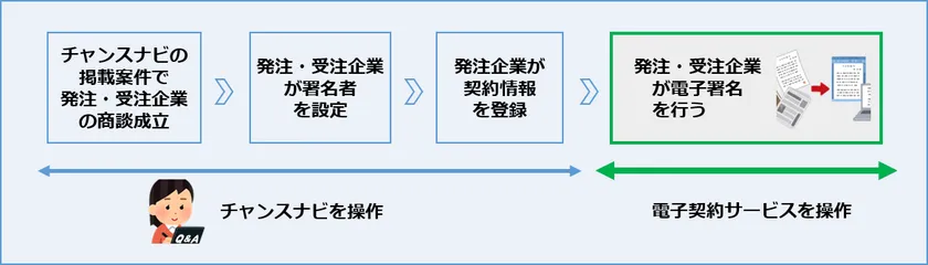 ビジネスチャンス・ナビ上に案件を掲載した発注企業と、エントリーを行った受注企業との契約締結に、本システムが提供する電子契約サービス(※)を利用することができます。