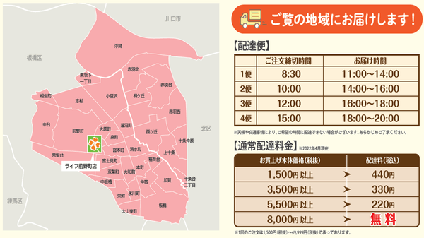 ライフネットスーパーのページをご覧いただき、お届け先が配達エリア内であれば、ご登録完了後すぐにご注文いただけます。