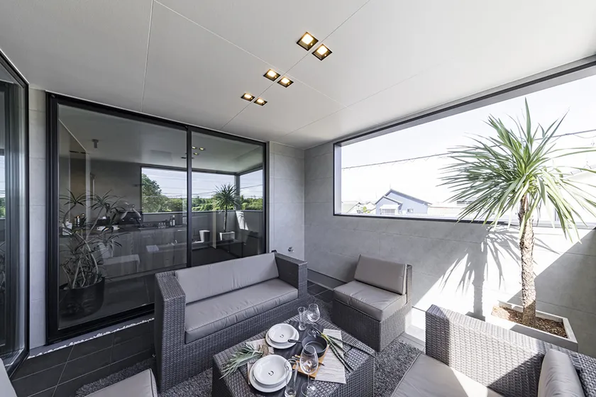 フラットにつながる、屋根の付いたインナーバルコニーつきのお家。屋外なのに天候の影響を受けにくいので、幅広い用途で利用できます。洗濯物や布団を干したり、家族と食事やティータイム、アウトドアリビングとしての活用もできます。二階に配置されているので、プライバシーも確保できて安心です。