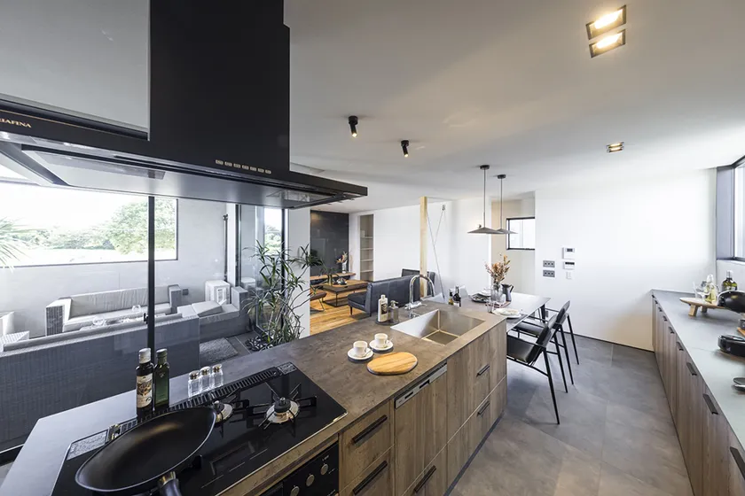 GLAMP最大の特徴は、見学した方々が口を揃えて「実際に見るとその良さに圧倒される」という、2階の開放感です。アウトドアリビング、屋内リビング、ダイニング、キッチンで構成された空間は、大きなガラス窓から視界が抜け、GLAMPの目印である十字窓や、屋根の半分が開いているアウトドアリビングの空へとつながり、想像以上の広がりを感じることができます。