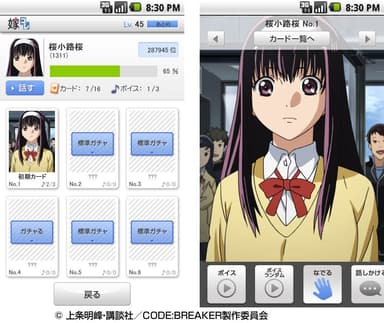 BIGLOBEは2月5日より、アニメやゲームキャラクターの録り下ろしボイスが聴けるカードコレクションアプリ「嫁コレ」(iPhone及びAndroid(TM)向け)(注1)に、アニメ『CODE:BREAKER』の“桜小路桜”を追加します。今回の追加によって、「嫁コレ」アプリで遊べるキャラクターは65作品、181キャラクターと、声優6人となります。