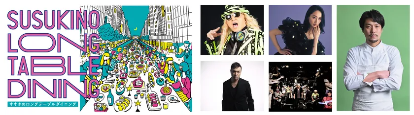 ホコ天となった駅前通りに、200mのロングテーブルを設置。その周りには、北海道のうまいものを提供する20以上のキッチンカーが集結し、定番の居酒屋メニューから多国籍料理、スイーツやカフェメニューまで幅広くラインナップします。また、テーブルの末端にはライブステージが登場。DJ KOOやMs.OOJA、DAISHI DANCE、渋さ知らずズオーケストラといった豪華アーティスト14組がすすきのらしいエンターテイメントステージを披露します。