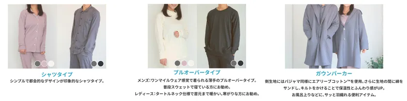 “エアリーブコットン(TM)”は繊維間に多くの空気を纏う糸であり、ふっくらとしたやさしい肌触りと優れた保温性が特長です。さらに、肌側に起毛加工を施すことで着た瞬間のひんやり感を軽減させました。