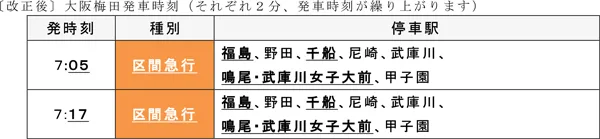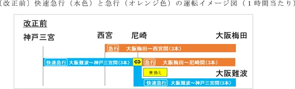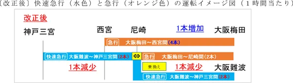 なお、大阪梅田~尼崎間の急行を1時間当たり1本、西宮まで延長しますので、大阪梅田~西宮間の運転本数は改正後も変わりません。