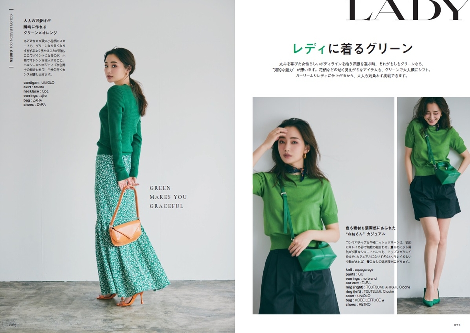 昨今トレンドである「カラーニット」「カラーコート」「カラーパンツ」などを使った華やぎのあるコーディネート実例も豊富です。