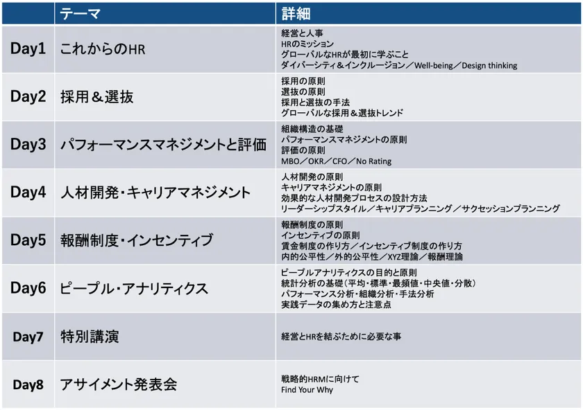 HRBP養成講座は、Day1からDay8までの8講座構成となっており、まず全体像を掴み、HRの各領域をテーマとした講義で理解を深め、特別講演で実践のヒントを得る構成となっています。