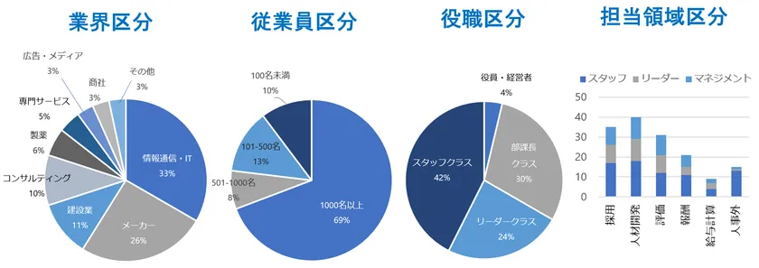 業界・企業規模・お役職・担当領域に偏りなくご参加頂いて参りました。受講者のうち、94%の方「HRに携わる同僚・友人に紹介したい」とご回答いただいております。