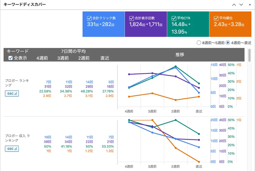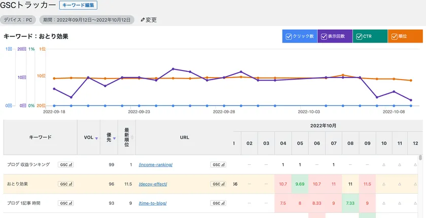 記事とキーワードの紐づけを管理画面で行うだけでなく、Google Search Consoleと連携することで、各キーワードの順位も表示されます。