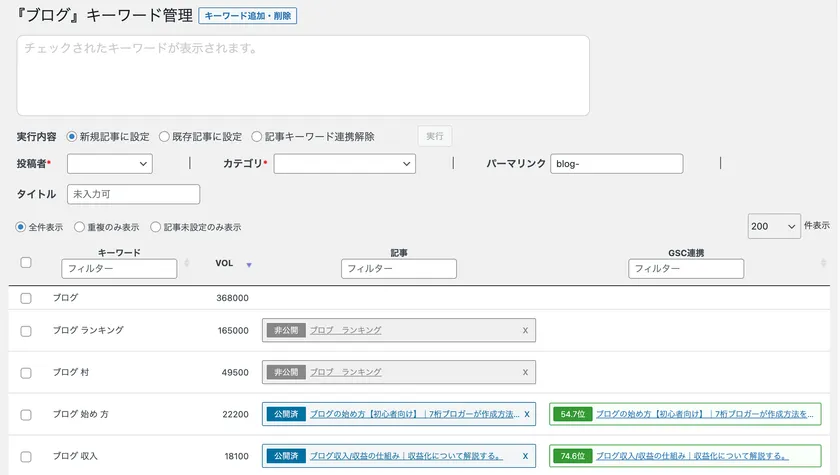また、一般的にキーワード管理作業はExcelやGoogleスプレッドシートなどを利用することが多いですが、本ツールを活用することによりWordPress上で行うことができます。