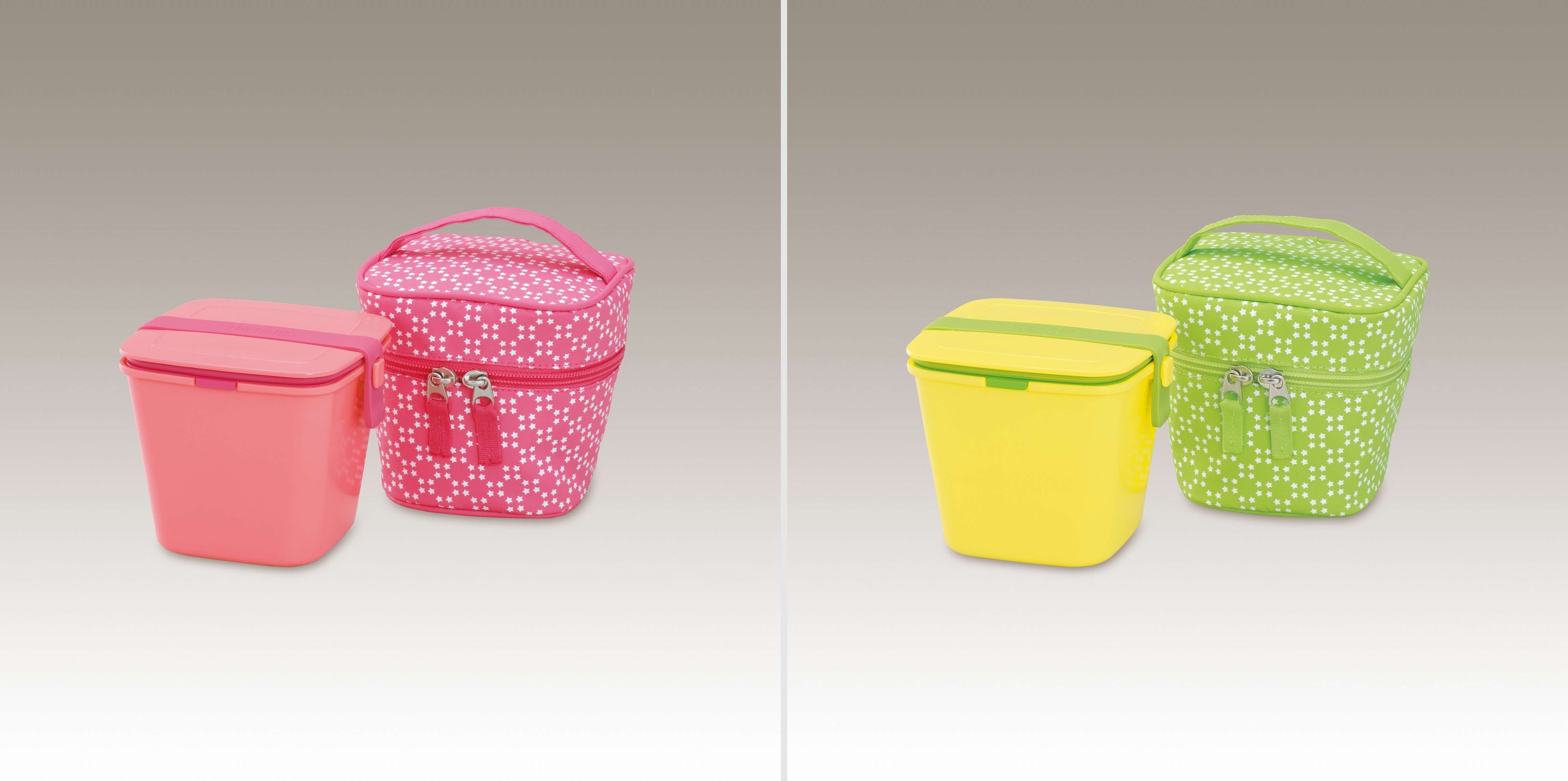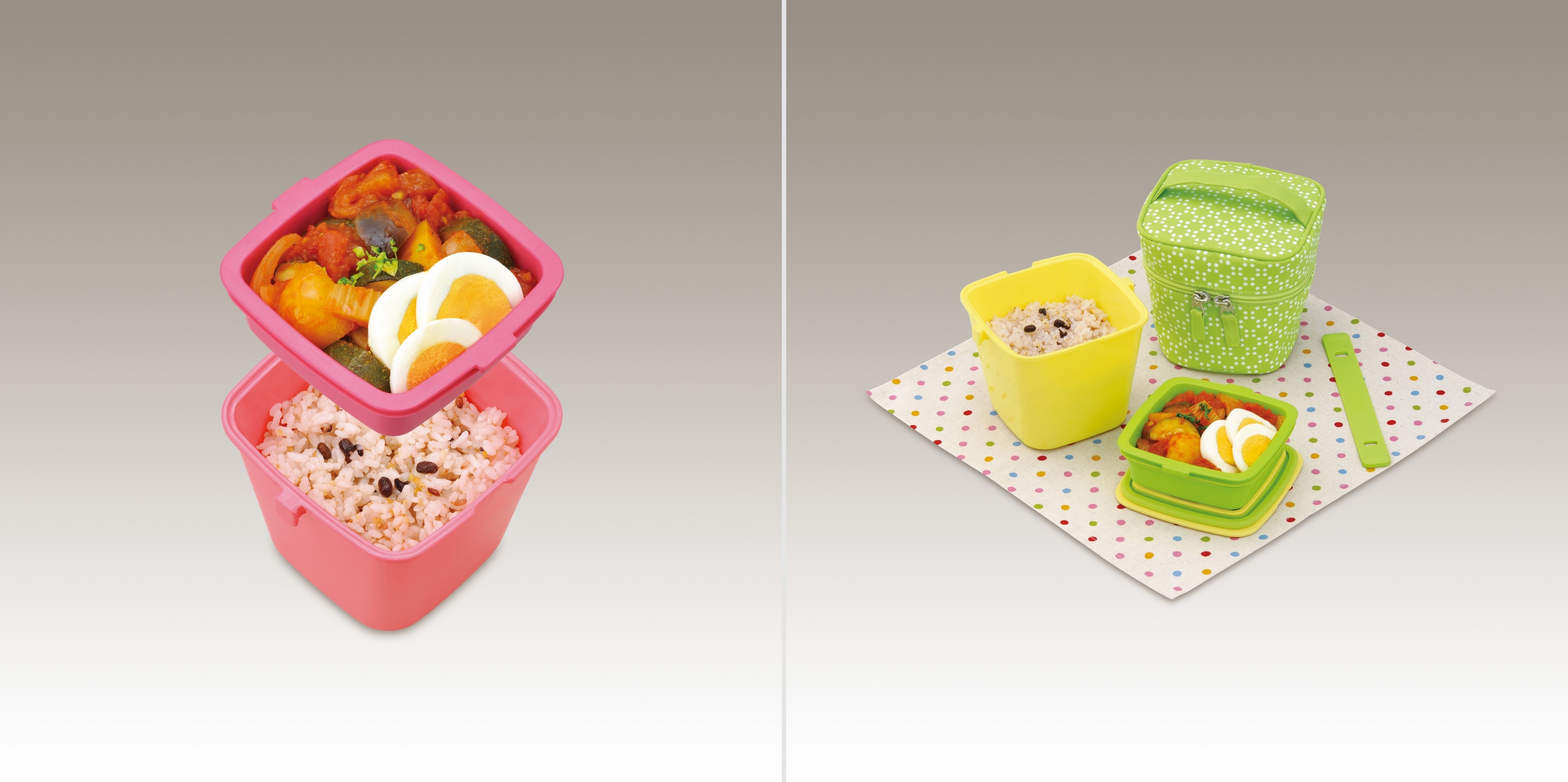 女性向けの「DJJ-600」は、「カフェごはんを楽しもう」をコンセプトにした新商品です。ドギーバッグ風のおしゃれな本体は、内容器と外容器に分かれており、それぞれおかずとご飯が入ります。フタにはパッキンが付いているので密閉性があり、安心です。専用保冷バッグには、スプーン等が入るミニポケットも付いています。今、人気のロコモコやタコライス、ビビンバなどのカフェメニューをランチにとりいれてみませんか。普段のお弁当が華やかな“カフェごはん”に生まれ変わります。