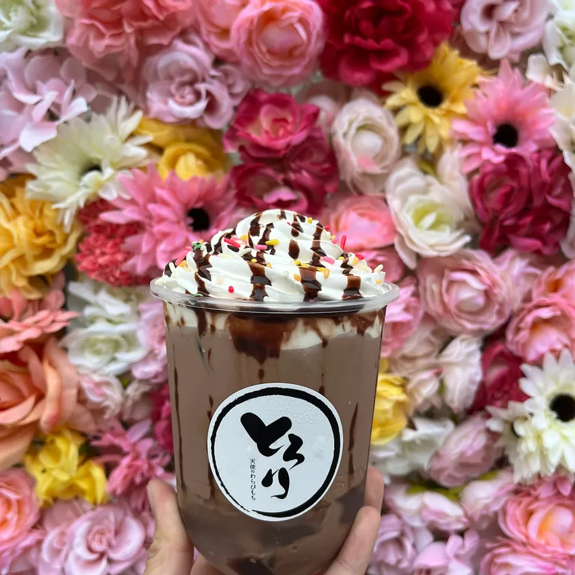 アルバイトの女子高生が「とろとろすぎて、ストローで飲めちゃうのでは」と発想し誕生した飲むスイーツ「飲むわらびもち」。カップの底にわらびもちを入れたドリンクに、生クリームをトッピングした“映える”見た目と新食感が話題となり、1日最高500杯販売する人気メニューとなりました。フレーバーは「ミルクティー」「黒蜜」「抹茶」「ショコラ」(各680円)をご用意いたします。