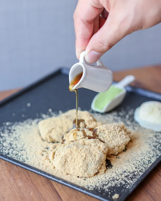 山菜のワラビの根の部分10kgから、わずか70gしか採れない、貴重な本わらび粉を使用しています。材料の配合や炊き方など試行錯誤を重ね、究極なやわらかさを追求し「とろとろ食感」が生まれました。爪楊枝が刺さらない程にやわらかいため、割りばしを添えて提供しています。たっぷりとまぶした甘さ控え目なきな粉と一緒にお召し上がりください。