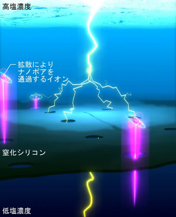 図2. ナノポアのイオン選択性を利用した逆電気透析発電。窒化シリコン表面は水中で負電荷を帯びるため、陰イオンはナノポア壁面で電気的な反発力を受ける。この効果のため、小さなナノポアになると、陰イオンは電気的な反発によりナノポアを通れなくなる。一方、陽イオンは反発を受けないため、ナノポアを通過できる。その結果、ナノポアに塩濃度差を与えると、陽イオンだけがナノポアを拡散移動することから、膜の間には電位差が生じる。