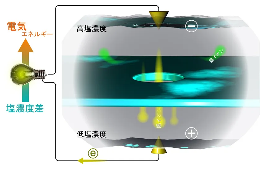 ナノポアは、極薄な膜に加工されたナノメートルスケールの細孔です。この膜の片側を高濃度の塩水、反対側を希薄な塩水で満たすと、濃度拡散によりナトリウムイオンや塩素イオンがナノポアを移動します。この時、ナノポアの壁面が負の電荷を帯びていると、陰イオンである塩素イオンは壁面で電気的に反発されます。この壁面の影響が現れるのは壁からせいぜい10ナノメートルほどの距離までですが、ナノポアのような極微な孔の場合には、ほとんどの塩素イオンが壁面で反発を受け、ナノポアを通過できなくなります。一方、ナトリウムイオンは陽イオンであるため、壁面で反発されることなくナノポアを移動します。つまり、負電荷を帯びた小さなナノポアは、ナトリウムイオンだけを通す特殊な水路になるわけです。すると、ナトリウムイオンは正の電荷を持つので、イオンの拡散によってナトリウムイオンだけがナノポアを通過することで膜の間には電圧が生まれます。これはすなわち、電荷を帯びたナノポアの両側に塩濃度差を与えることで、電気を取り出すことができるということを意味します(図2)。