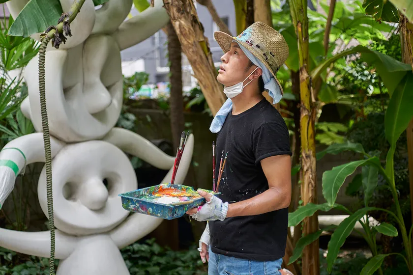 2018年に岡本敏子賞を受賞した彼は、翌2019年に第1展示室で特別展示「太郎は戦場へ行った」を、2021年には庭で壁画「焼夷弾は街に一発も落ちない」を制作するなど、当記念館を舞台に岡本太郎と対峙する作品をつくりつづけてきた作家です。