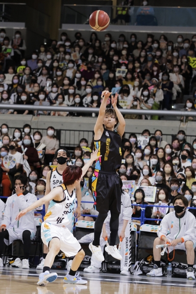 ハーフタイムショーでは、高野率いる俳優たちによる光るボールを取り入れた幻想的でキレキレなパフォーマンスと、丘山とサプライズで登場した鳥越裕貴らは自身のユニット「WINWIN」の曲を披露してのパフォーマンスで会場を沸かせ、後半戦に突入。3rdクォーターが終わったところで36対26とDREAM CATERPILLARSがリードを広げたところで、救済企画とも言える“各チームのヘッドコーチによるフリースロー5番勝負”が行われた。通常のフリースローサークルからのシュートは1点、3ポイントラインからのフリースローは3点、さらに10点が加算されるコート中央のセンターサークルからのロングシュートの中から選んで5本シュートするというルール。DREAM CATERPILLARSの岸 祐二が3ポイントシュートを決めたものの、SPARK SEEDSの荒木健太朗がロングシュートを決めて10点をゲット。「39対36」の3点差で4thクォーターが始まった。残り3分26秒で「48対48」の同点となり、その後も両チームが点を加え、最終結果は55対56でSPARK SEEDSが見事な逆転勝利を収めた。