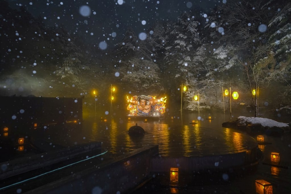 青森屋では、冬限定で絶景風呂雪見露天「ねぶり流し灯篭」を実施します。ねぶり流しとは、穢れを祓うため川や海に灯篭を流す行事で、青森ねぶた祭の起源として伝えられています。2012年に開始してから11年目を迎える今冬は、新しい山車「雷神」が登場します。祭りばやしの笛の音色が流れる時間を設け、雪見露天とねぶたを同時に満喫できる幻想的な湯浴みの時間を演出します。