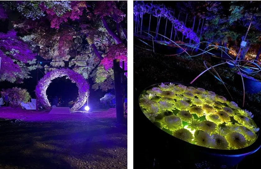 弘前城天守や櫓、城門の通常ライトアップに加えて、楓と桜の紅葉特別ライトアップを行います。また、ねぷた絵を使用した行灯「錦の灯り」、篝火を設置して弘前公園の夜を演出します。