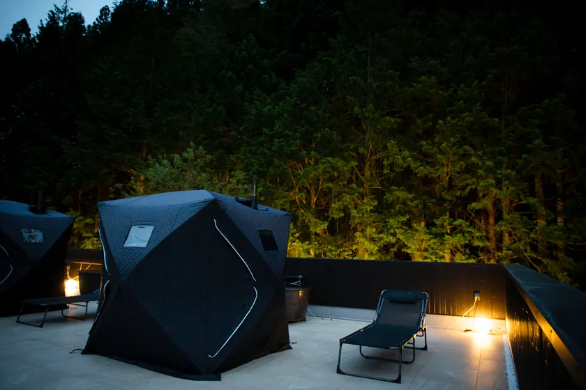 ぐるりと山々を見渡せる屋上には、テントサウナを用意。