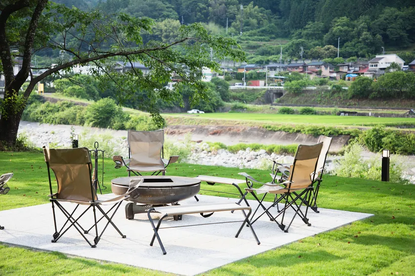 <川と木々に囲まれた焚き火が楽しめる焚き火スペース>