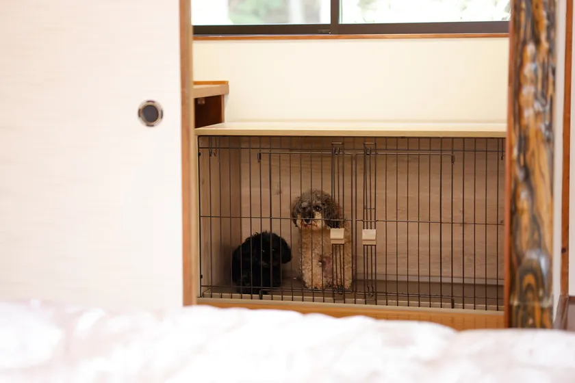 <お部屋には広々としたケージも完備。愛犬と一緒に寛ぎの空間>