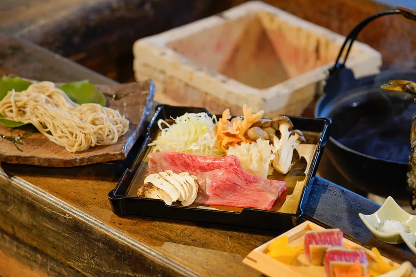 希少な宮崎の「尾崎牛」を使った西麻布「常」監修の肉割烹に、地元の食材、秋冬は松茸を贅沢に使った囲炉裏会席をご提供。