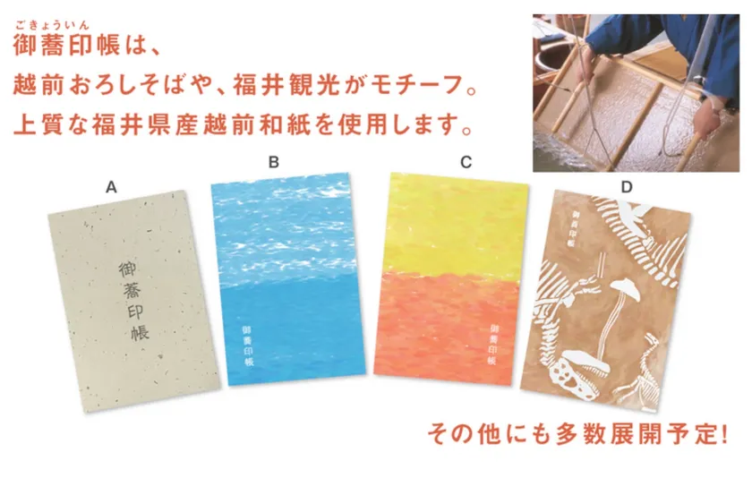 それぞれの御蕎印帳は福井県やおろしそばをテーマにデザインされており、福井県で有名な恐竜が描かれているデザインやカップル、夫婦、友人同士でペアでお使いいただけるデザインなどもあります。