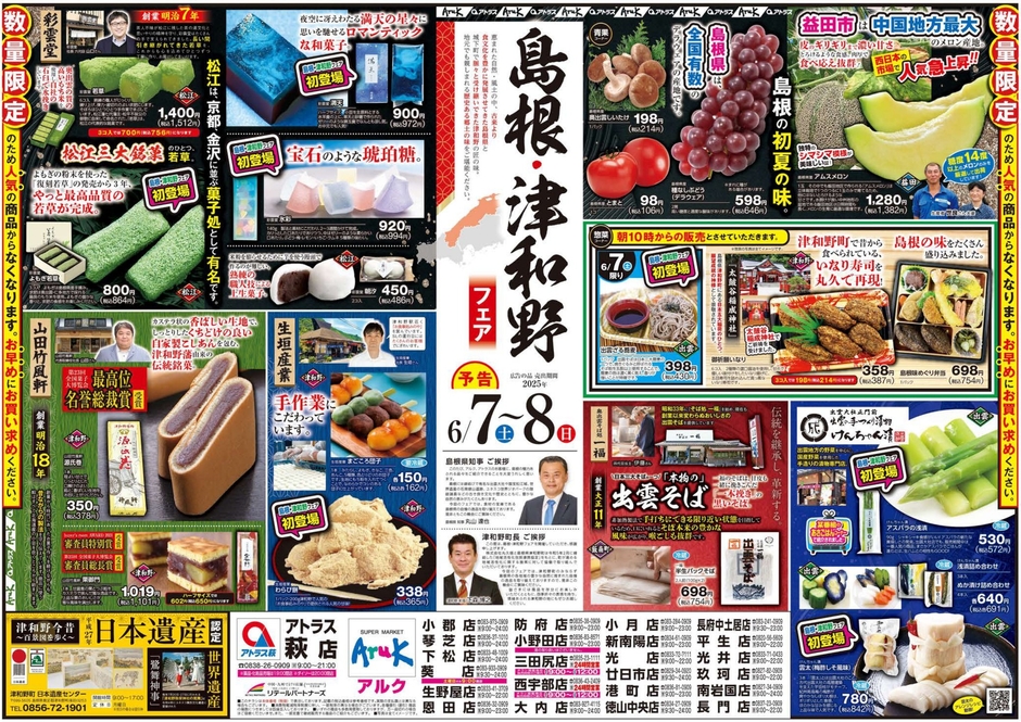 山口県を中心にスーパーマーケットを展開する株式会社丸久(本社:山口県防府市江泊1936 代表取締役:田中康男)のアルク全店、中央フード・サンマートの一部店舗では、6月7日(土)~6/8(日)の二日間、風情豊かな街並みと食文化で知られる島根県・津和野町に焦点を当て、銘菓や絶品グルメをお客様にお届けします。