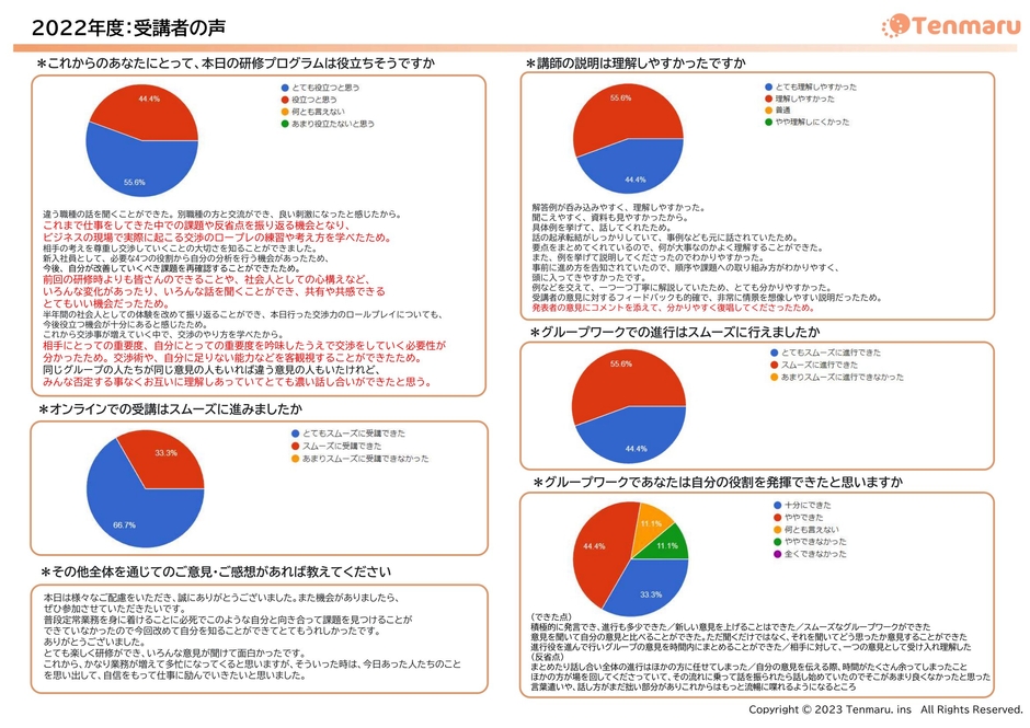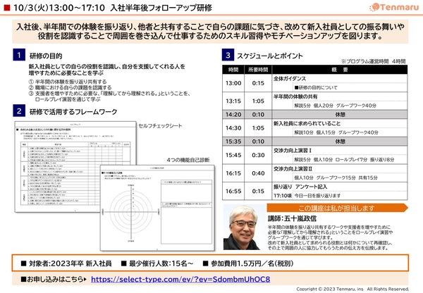 組織づくりや人材教育・キャリア開発、人材採用支援を行う株式会社Tenmaru(本社:東京都港区、代表取締役:諸戸 歩)は、2023年10月、入社後半年経過する新入社員を対象として、公開フォローアップ研修を行います。半年間の学びの棚卸しや今後の課題把握のみならず、職場での相互理解を促進し支援を受けやすくするコツを演習を通じて学びます。